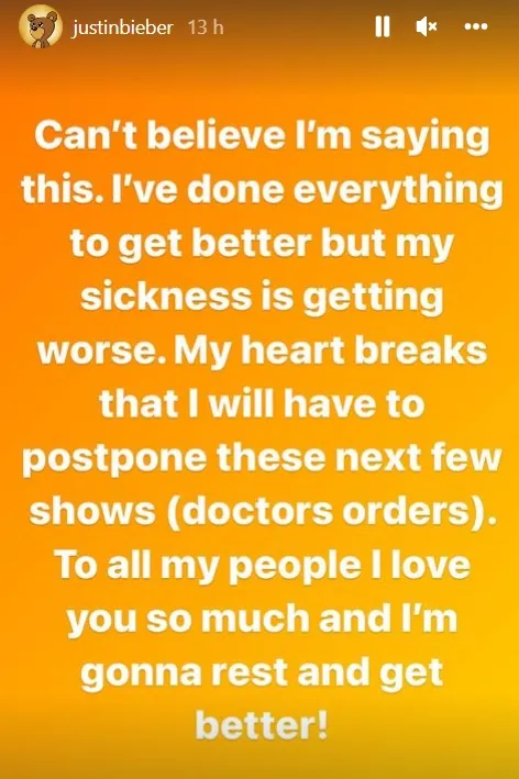Bieber heeft zijn fans via Instagram op de hoogte gebracht van het slechte nieuws. "Ik kan niet geloven dat ik dit moet schrijven "Ik heb er alles aan gedaan om beter te worden, maar ik word steeds zieker."