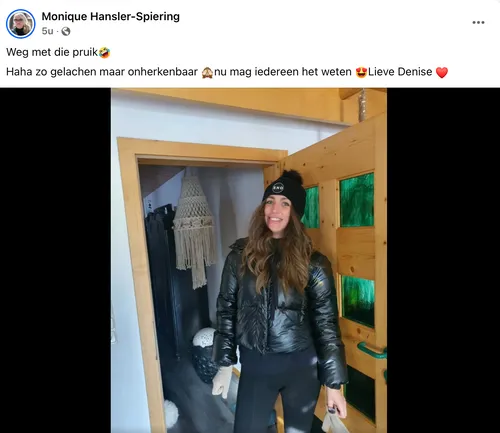 Monique vindt het allemaal om te gieren. "Weg met die pruik. Haha, zo gelachen, maar onherkenbaar. Nu mag iedereen het weten lieve Denise."