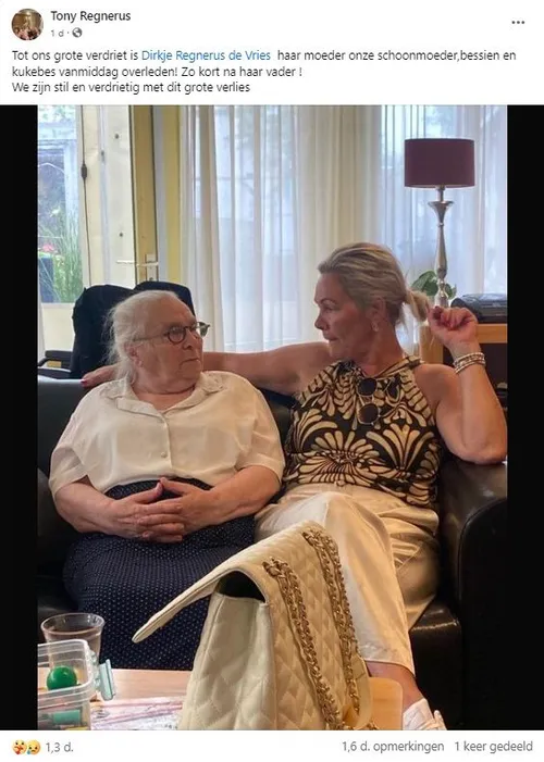 Tony schijft op Facebook dat de moeder van Derrekien afgelopen zondag (gisteren) is overleden. ''Zo kort na haar vader! We zijn stil en verdrietig met dit grote verlies.'' Het is momenteel niet duidelijk waarin de moeder van Derrekien is overleden.