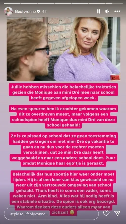 ''Puur omdat Monique haar ego'tje is geraakt. Belachelijk dat hun zoontje hier onder moet lijden. Hij is al een keer van klas gewisseld en nu weer uit zijn vertrouwde omgeving van school gehaald. ''Thuis heeft ie soms een vader, soms weken niet. Arm kind. Alles wat hij nodig heeft, is een stabiele situatie'', zo sluit de roddelvlogster af.