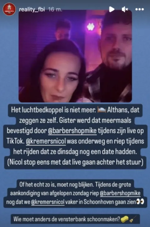 Nicol Kremers trok enkele dagen geleden in bij kapper Mike in zijn kapsalon, maar is weer vrijgezel. Dat heeft Mike bekendgemaakt via zijn TikTok. Wat is er gebeurd?