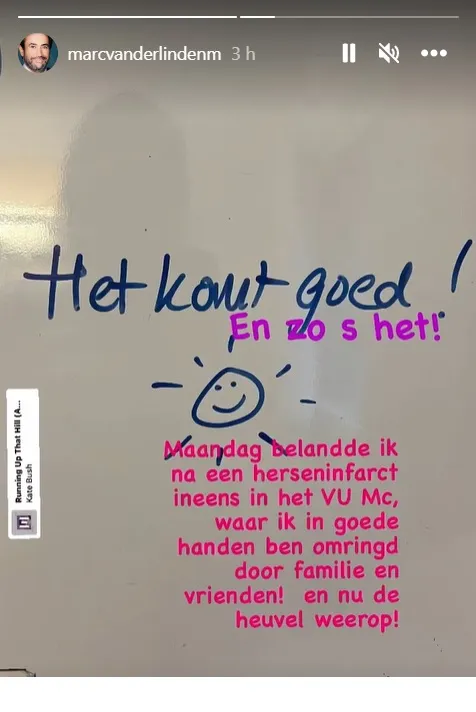 Dat meldt hij zelf via Instagram. ''Maandag belandde ik na een herseninfarct in het VUmc.'' Hij meldt in goede handen te zijn en is naar eigen zeggen omringd door vrienden en familie.