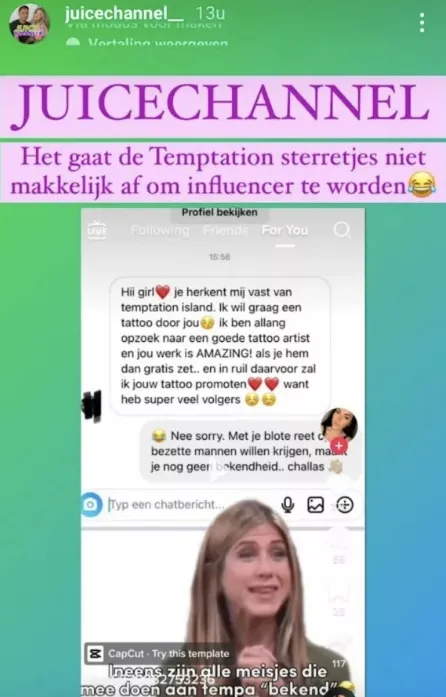 In het gesprek is het volgende te lezen: ''Hiii girl, je herkent mij vast van Temptation Island. Ik wil graag een tattoo door jou.''