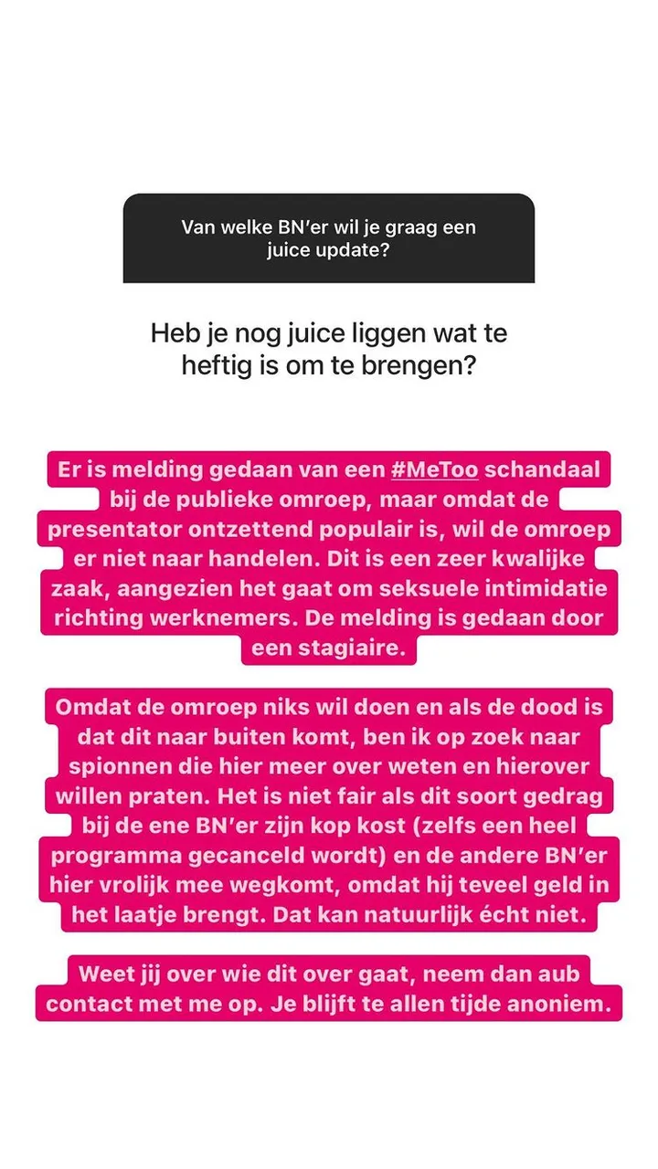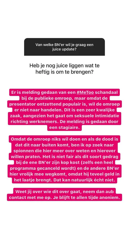 Bij de publieke omroep zijn er volgens Coldeweijer ook nog genoeg verhalen over mannen die zich misdragen: “Er is melding gedaan van een #MeToo-schandaal bij de publieke omroep, maar omdat de presentator ontzettend populair is, wil de omroep er niet naar handelen. Dit is een zeer kwalijke zaak, aangezien het gat om seksuele intimidatie richting werknemers.”