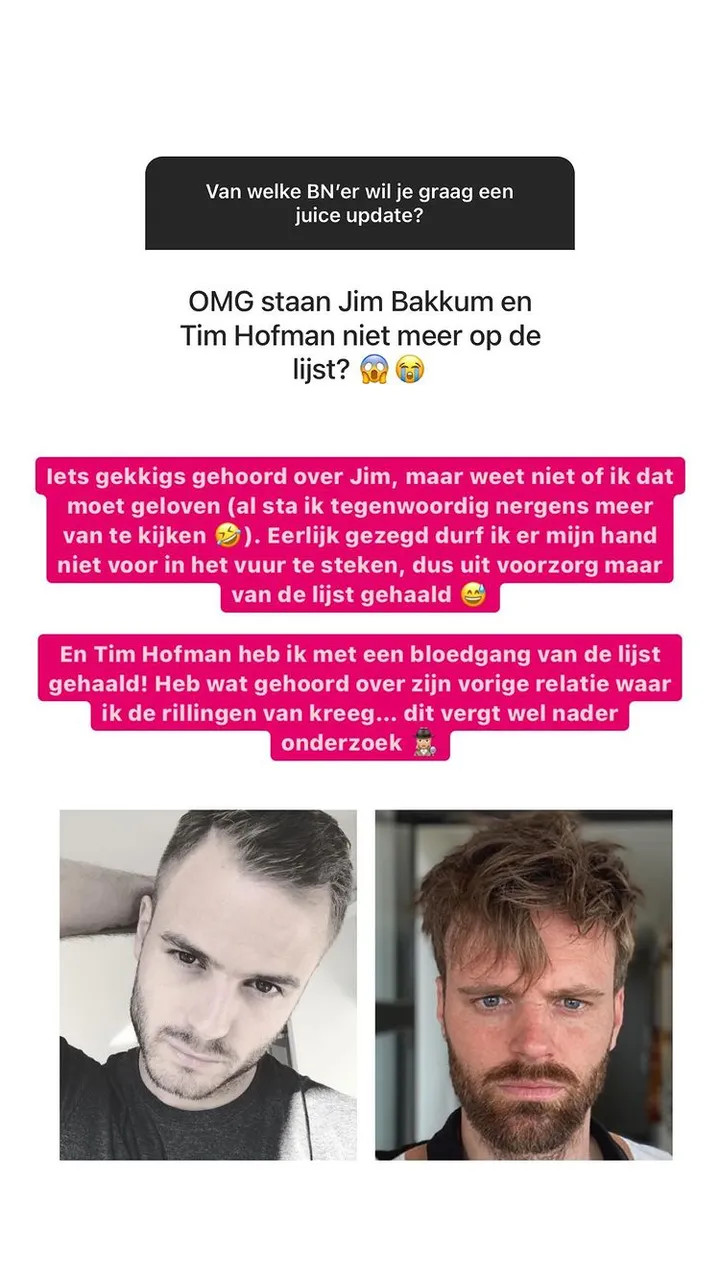 Maar daar blijft het niet bij. Niemand minder dan Jim Bakkum wordt ook genoemd op haar kanaal: “Iets gekkigs gehoord over Jim, maar weet niet of ik dat moet geloven (al sta ik tegenwoordig nergens meer van te kijken ?). Eerlijk gezegd durf ik er mijn hand niet voor in het vuur te steken, dus uit voorzorg maar van de lijst gehaald. ?)”