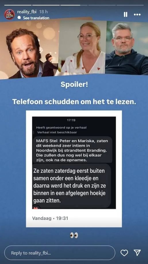 ''MAFS-stel Peter en Mariska zaten dit weekend zeer intiem in Noordwijk bij strandtent Branding. Die zullen dus nog wel samen zijn, ook na de opnames.'' En er is nog meer informatie, want Peter en Mariska begonnen nog eventjes knus onder een dekentje, waarna ze binnen op een afgelegen plekje gingen zitten.