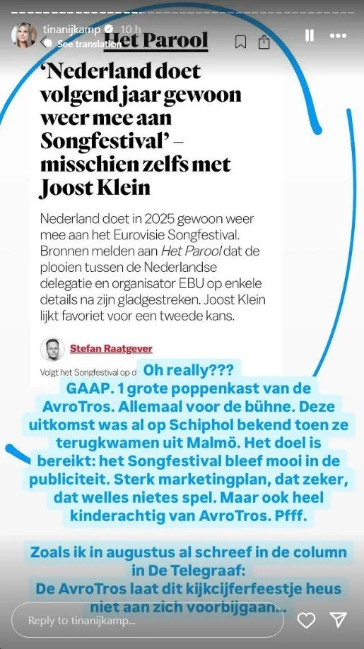 Nijkamp haalt hard uit op Instagram: ''Een grote poppenkast van de Avrotros. ,,Allemaal voor de bühne. Deze uitkomst was al op Schiphol bekend toen ze terugkwamen uit Malmö. Het doel is bereikt: het Songfestival bleef mooi in de publiciteit.''