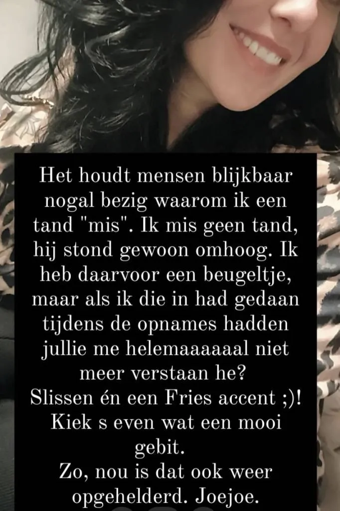 Antine heeft op social media een foto geplaatst van haar gebit. Hierbij schrijft ze: ''Het houdt mensen blijkbaar nogal bezig waarom ik een tand mis.''