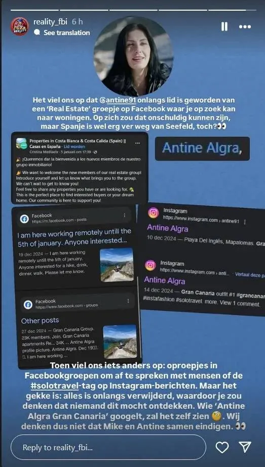 Het Instagramkanaal RealityFBI ontdekte onlangs dat Antine lid geworden is van een Facebookgroep, waar ze aangaf te zoeken naar een huis in Spanje. Dat is natuurlijk vrij ver van Mike en zijn moeder in Seefeld.