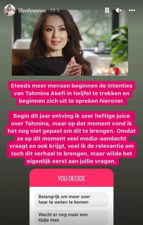 ''Begin dit jaar ontving ik zeer heftige juice over Tahmina. Maar op dat moment vond ik het nog niet gepast om dit te brengen. Omdat ze op dit moment veel media-aandacht vraagt en ook krijgt, voel ik de intentie om toch dit verhaal te brengen, maar wilde het eigenlijk eerst aan jullie vragen."