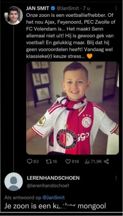 ''Onze zoon is een voetballiefhebber. Of het nou Ajax, Feyenoord, PEC Zwolle of FC Volendam is… Het maakt Senn allemaal niet uit! Hij is gewoon gek van voetbal! En gelukkig maar. Blij dat hij geen vooroordelen heeft! Vandaag wel klassieke(r) keuze stress… ?''