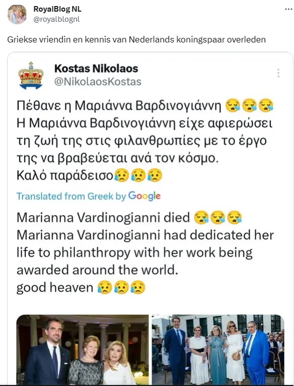 Koning Willem-Alexander en koningin Máxima hebben verschrikkelijk nieuws te horen gekregen. Een erg goede vriendin van Máxima is namelijk heengegaan. Het gaat om Marianna Vardioyannis uit Griekenland. De vrouw is 80 jaar oud geworden.