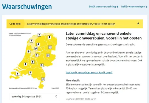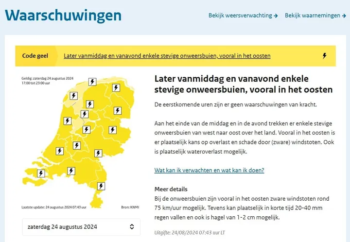 Het KNMI heeft inmiddels code geel afgegeven voor heel Nederland. Zij maken ook melding van windstoten die snelheden kunnen bereiken tot wel 75 kilometer per uur. Onderstaand een screenshot van de site: