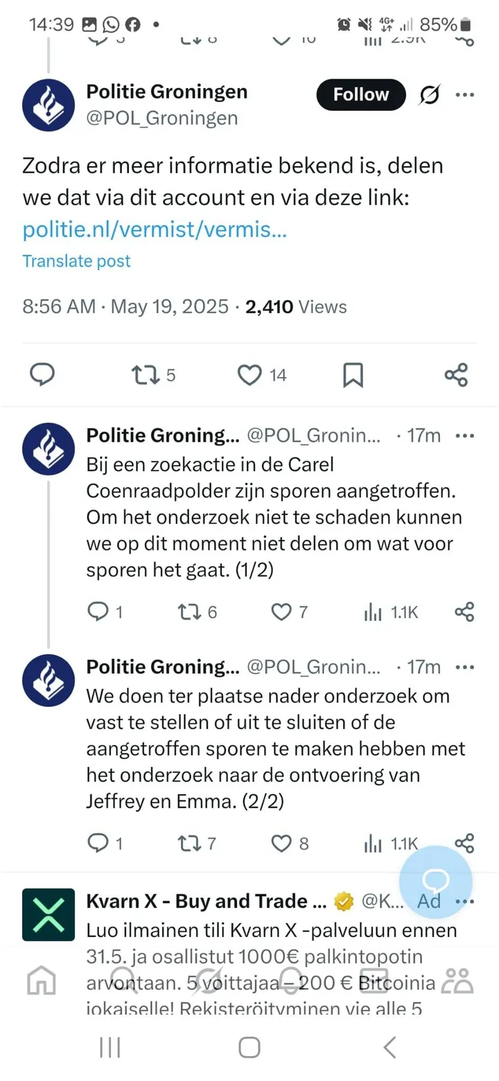 Gisteravond is er naar aanleiding van een tip gezocht in Finsterwolde. Hier werd in eerste instantie niks gevonden. Vandaag wordt er uiteraard opnieuw gezocht naar de kinderen, en nu is er een aanwijzing gevonden, aldus
