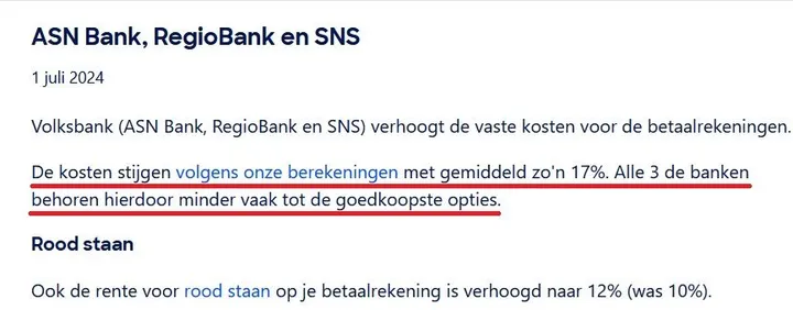 ASN, RegioBank en SNS maken het nog bonter. Volgens berekeningen van De Consumentenbond verhoogt het drietal banken de prijzen met 17! procent.