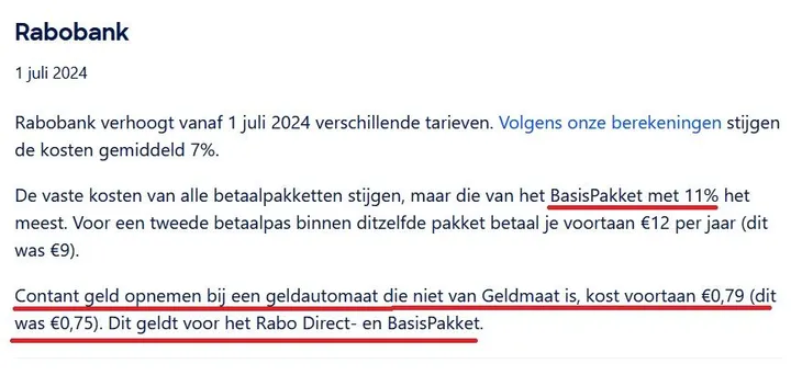 Als je een tweede betaalpas wil binnen ditzelfde pakket, ga je daar in plaats van 9 euro nu 12 euro voor betalen. Ook gaat Rabobank meer rekenen voor het opnemen van contant geld bij andere automaten dan Geldmaat. Je gaat daar 0,79 euro per transactie voor betalen.