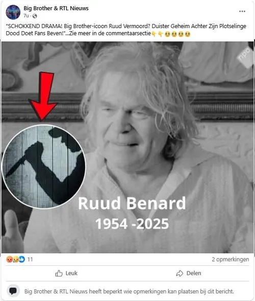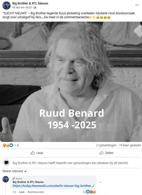Het bewuste bericht verscheen op de Facebookpagina 'Big Brother en RTL Nieuws'. Hier werd de foto van Ruud gedeeld, waarbij werd aangegeven dat Ruud 'plotseling is overleden'.