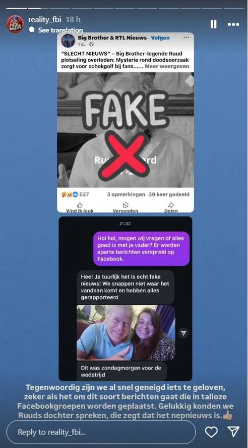 De familie van Ruud heeft de berichtgeving inmiddels ook meegekregen. In een reactie aan het kanaal RealityFBI heeft de dochter van Ruud laten weten dat het gelukkig niet klopt.