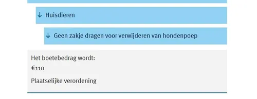 Voor het ‘geen zakje dragen voor verwijderden van hondenpoep’, moet je in 2025 een bedrag betalen van €110,00. En dat is exclusief 9 euro administratiekosten.