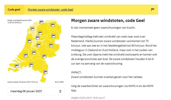 Helaas is er slecht nieuws voor morgen, want het KNMI waarschuwt ons morgen voor zware windstoten. Daarvoor heeft het weerinstituut code geel afgegeven voor alle provincies.
