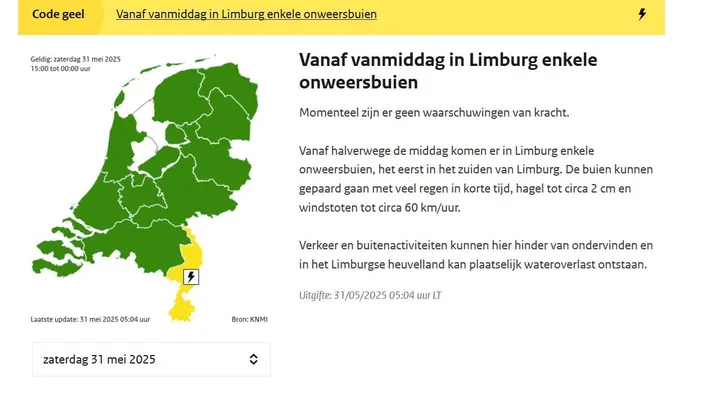 Het KNMI meldt ook dat er in Limburg een kans is op wateroverlast. Mensen worden gewaarschuwd voor hinder op de wegen en bij buitenactiviteiten.