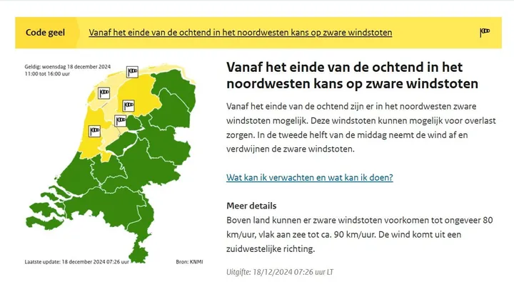 De waarschuwing van het KNMI geldt tussen 11.00 en 15.00 uur en kan voor hinder zorgen. Later in de middag neemt de wind in kracht af, en wordt het tijdelijk droger. Tegen de avond keren buien echter terug, terwijl de wind weer even afneemt.