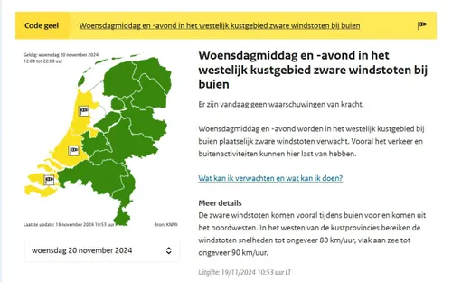 Het KNMI (Koninklijk Nederlands Meetinstituut) waarschuwt inwoners van de westelijke kustgebieden. Er is code geel afgegeven voor morgenmiddag- en avond in verband met zware windstoten. Die kunnen maar liefst snelheden bereiken tot wel 90 kilometer per uur.