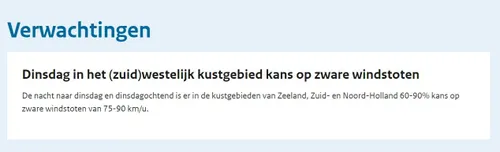 Wel is al duidelijk dat de wind krachtig zal waaien. Het KNMI voorspelt een kans van '60 tot 90 procent' op zeer zware windstoten in de kustgebieden van Zeeland, Zuid-Holand en Noord-Holland. De windsnelheden kunnen dan uitkomen tussen de 75 en 90 kilometer per uur.