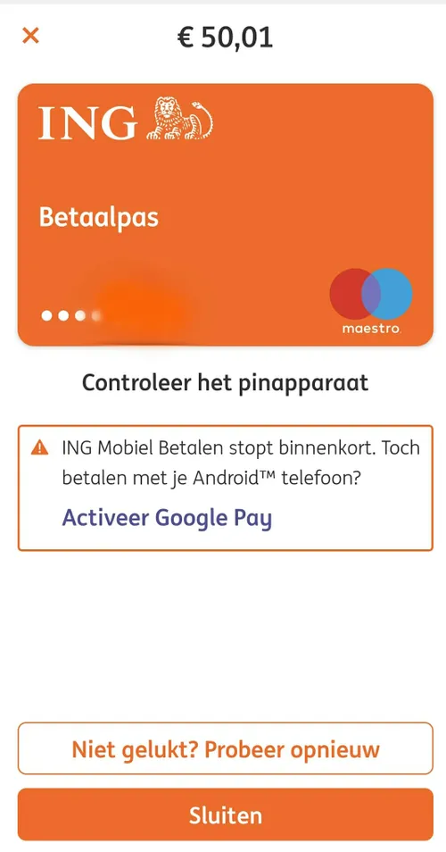 De optie om ING Mobiel Betalen te activeren is nu al niet meer beschikbaar. ING biedt Google Pay aan als enige alternatief.