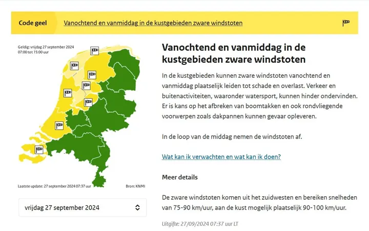 Het KNMI heeft code geel uitgevaardigd voor in totaal vijf provincies. Het gaat om Friesland, Noord-Holland, Zuid-Holland, Flevoland en Zeeland.