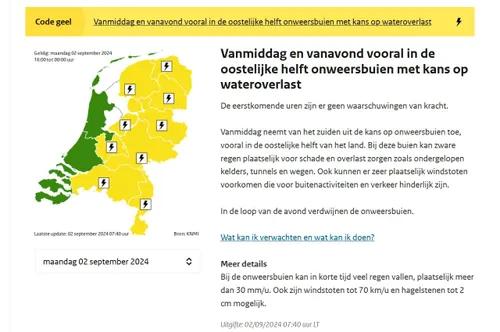 De weerwaarschuwing gaat om 16.00 uur in voor de provincie Noord-Brabant en Limburg. Vanaf 17.00 uur geldt dat voor de provincies Gelderland, Utrecht, Flevoland en Overijssel.