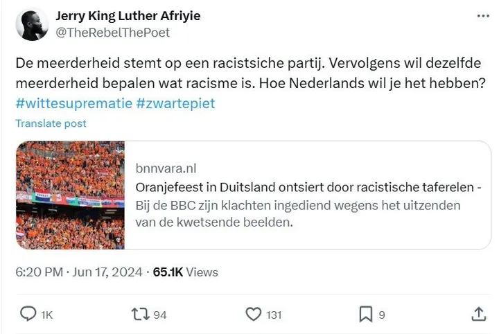 ''De meerderheid stemt op een racistische partij. Vervolgens wil die zelfde meerderheid bepalen wat racisme is? Hoe Nederlands wil je het hebben?'' Hij gebruikt de hashtags #wittesuprematie en #zwartepiet onder zijn bericht.