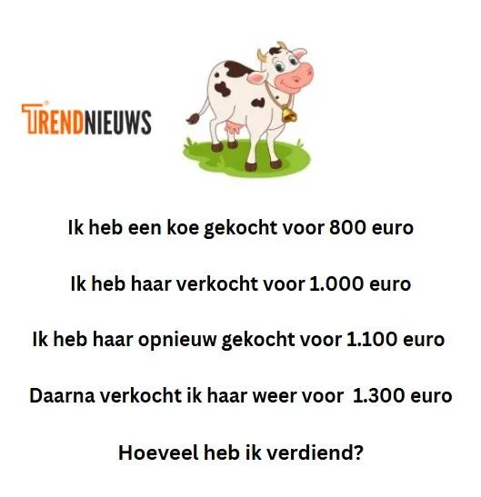 In deze puzzel koopt iemand een koe voor 800 euro. Vervolgens verkoopt hij de koe voor 1.000 euro. Daarna koopt hij de koe terug voor 1.100 euro en verkoopt het dier weer, deze keer voor 1.300 euro. De vraag is: hoeveel winst maakt hij uiteindelijk?